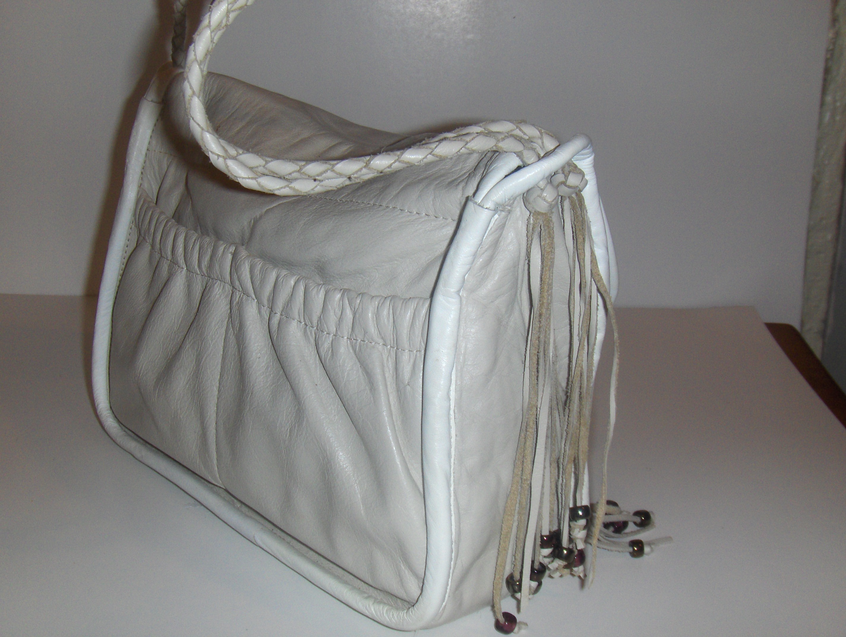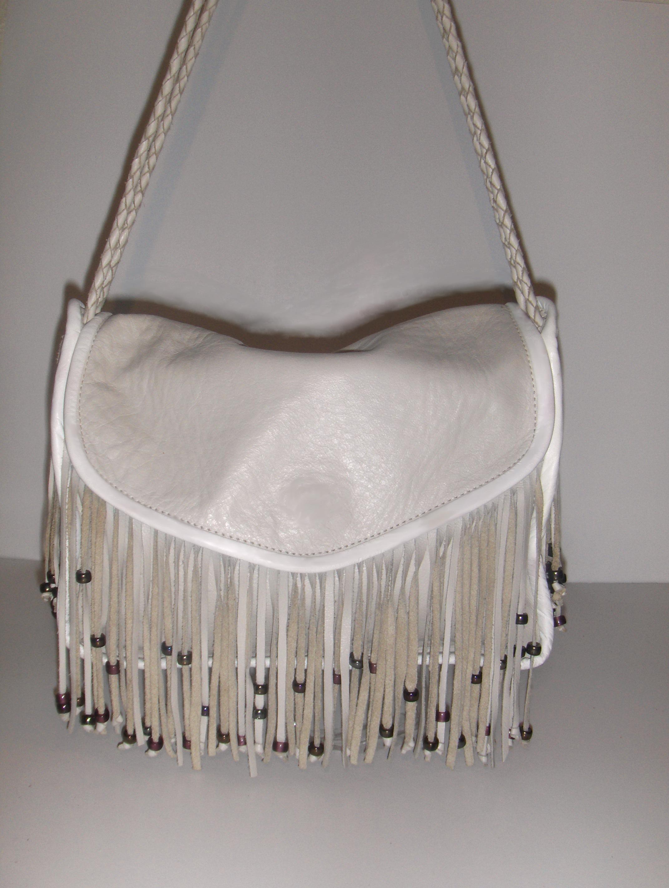 large fringed Bag with Beads. Cream with white trim. Choose any color combination along with colored beads or metal.  Measuring 11” W x 7” H x 3 ˝” Deep.