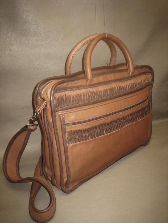 Make a statement with this attractive, yet practical genuine leather briefcase featuring a hand braided appliqué across the front zipper pocket, and an additional duo-color twist across front and back. Inside zipper pocket compartment separator.