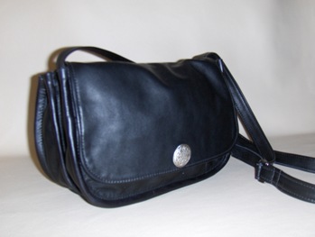 Wide Traveler handbag with leather interior zipper security pockets and separate compartments .