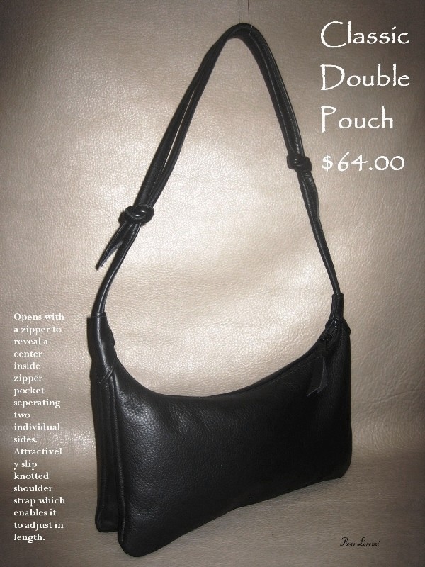 Leather Classic Double leather Purse 12” Long x 7” High. Great Leather shoulder pocket book Two pouches with one zipper opening along with an inside 7” center zippered pouch. Opens with a zipper to reveal a center inside zipper pocket separating two individual sides. Attractively slip knotted shoulder strap which enables it to adjust in length.