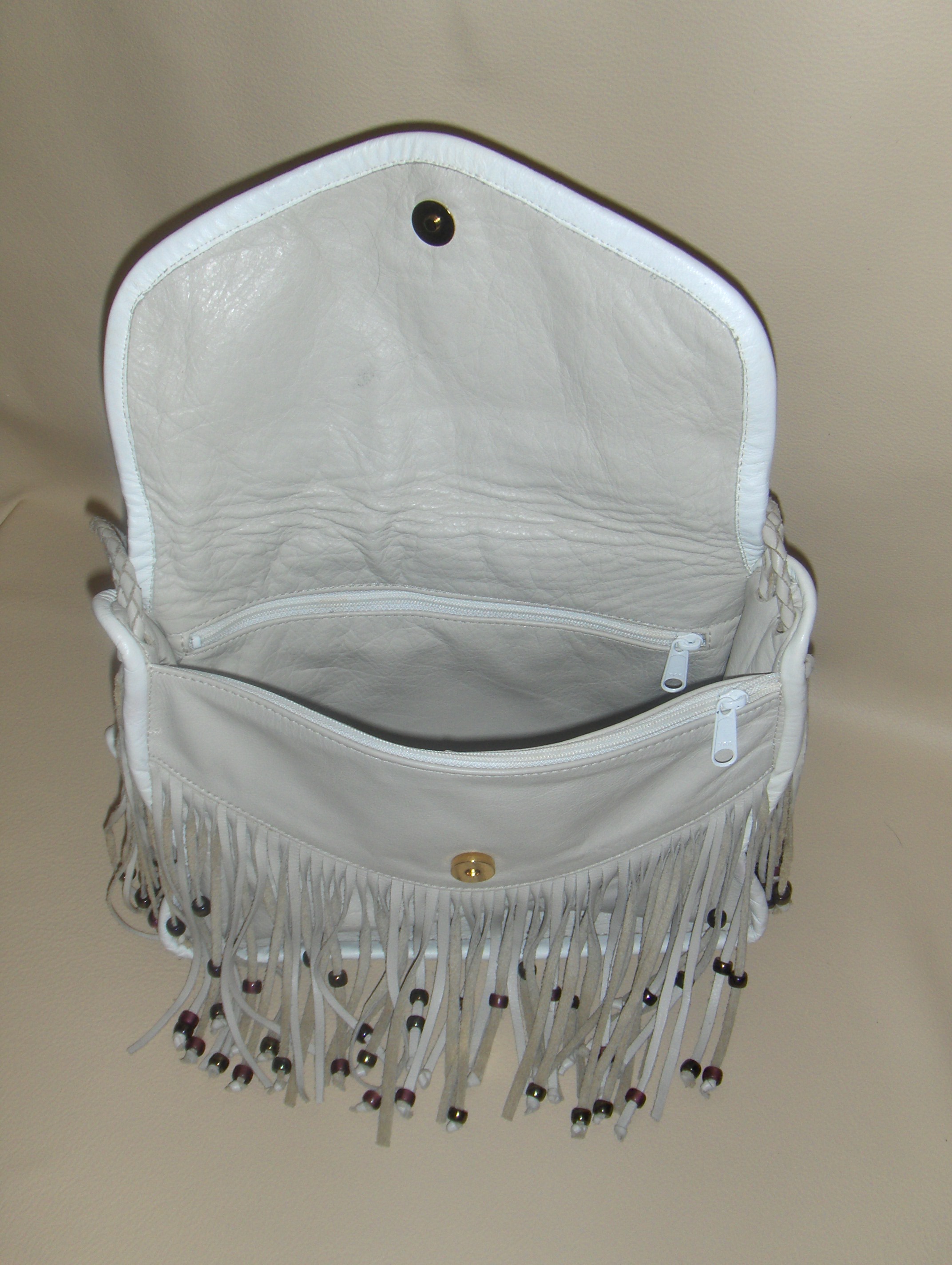 large fringed Bag with Beads. Cream with white trim. Choose any color combination along with colored beads or metal.  Measuring 11” W x 7” H x 3 ˝” Deep.