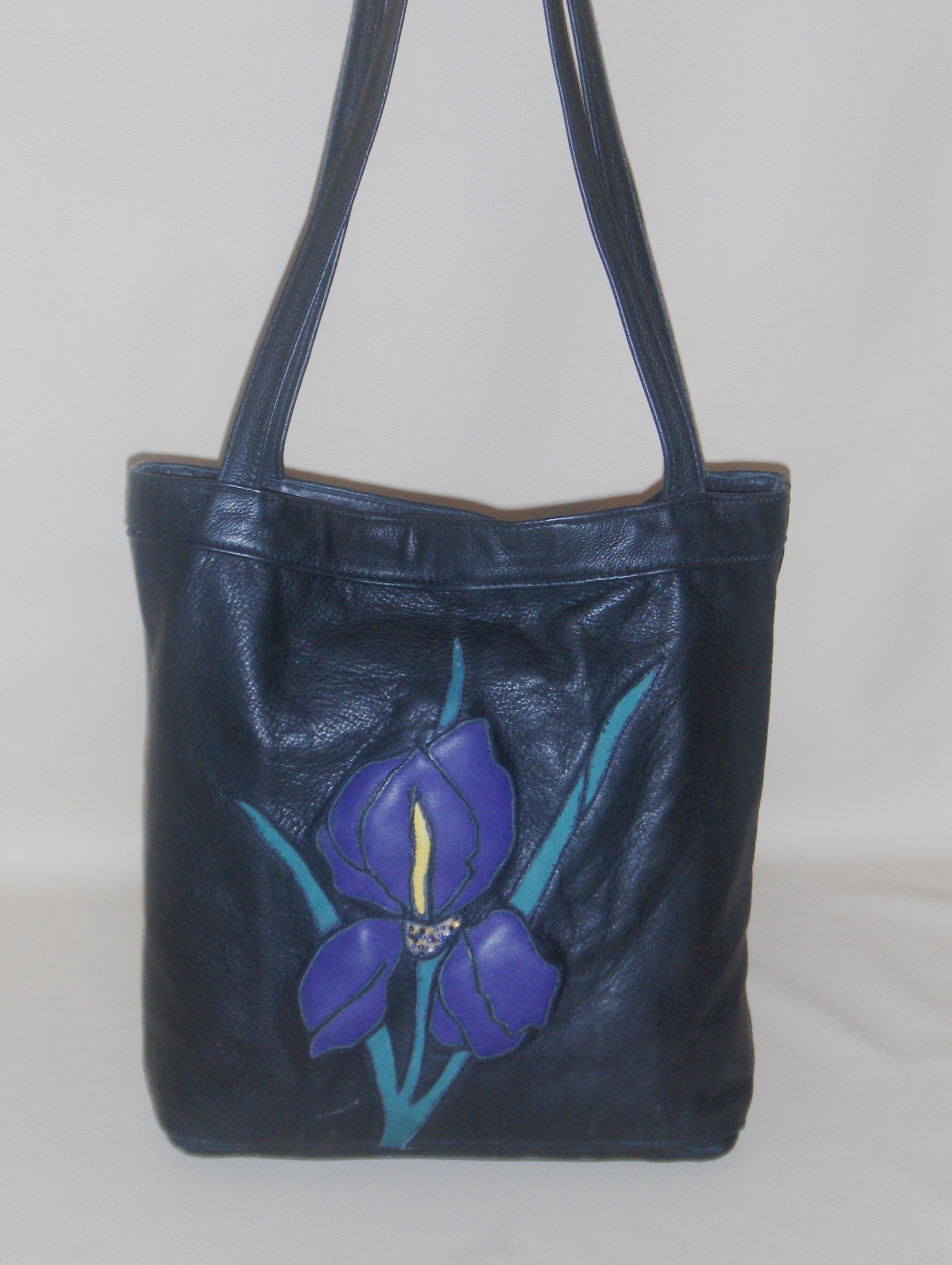 Iris Appliqué Bag 10” W x 12” H x 4” Bottom with two – 30” Straps. Large 8” W x 10” H Back Pocket and a Magnetic Snap closure, fully lined with an 8” inside zipper pocket.