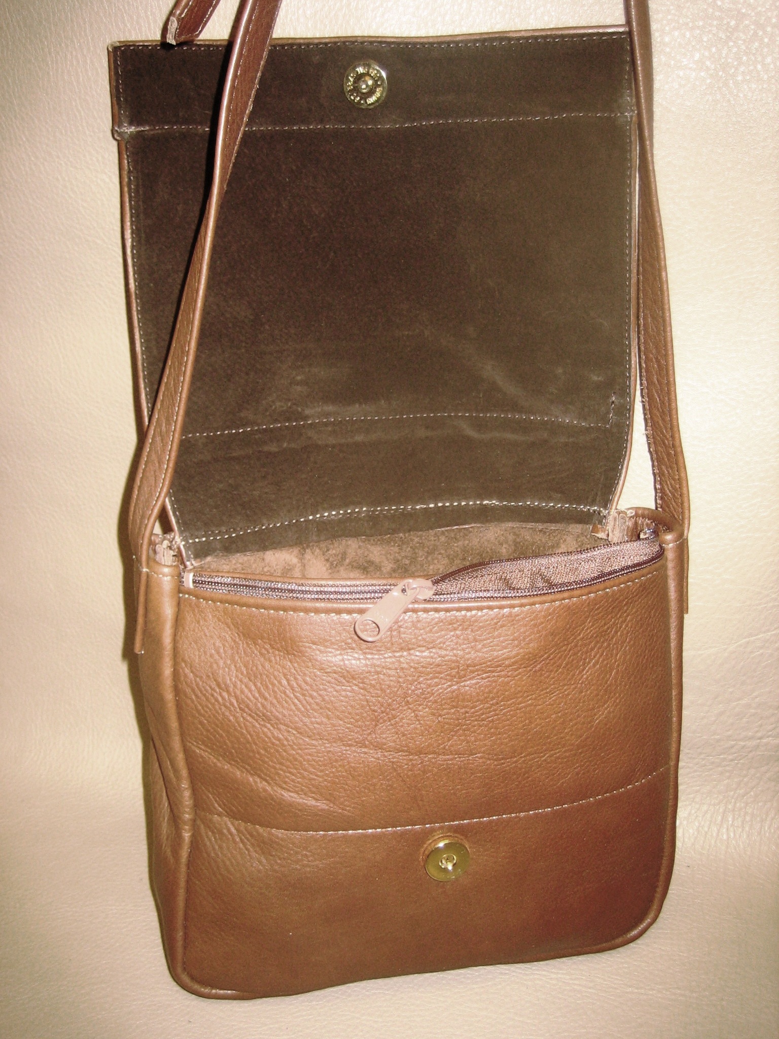 Pocket Flap Bag $160.00 9”wide x 9” long x 2 ˝” thick Average sized bag perfect for everyday use with several leather pockets. Front flap zipper pocket, full back pocket, and inside zipper pocket.
