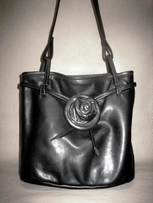 Rose Wrap BagBeautiful rose wrap look does not interfere with the easy accessible zipper opening and closure. Includes a small pocket in back of bag and a 7" inside leather zipper pocket. 11" wide x 9" high x 3 1/2 wide bottom