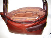 14” W x 10” H x 3” Bottom Designed with complimentary colors or all one color if desired. Zipper closure with front zip pocket and back zipper pocket. Inside features a leather zipper center pocket dividing the two sides, with an additional 8” zipper pocket inside.