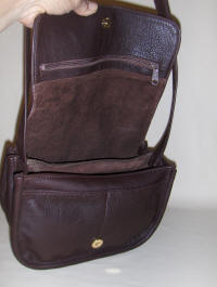 Wide Traveler handbag with leather interior zipper security pockets and separate compartments .